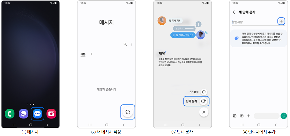 메시지 > 새 메시지 작성 > 단체 문자 > 연락처에서 추가 > 수신인 선택 후 완료 > 메시지 작성