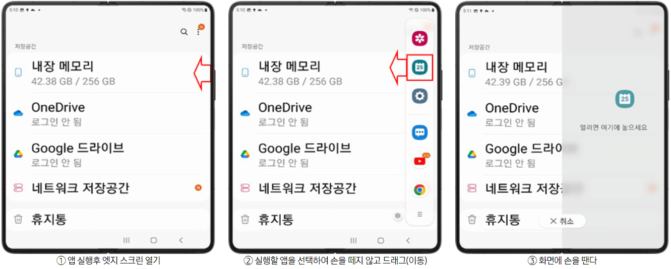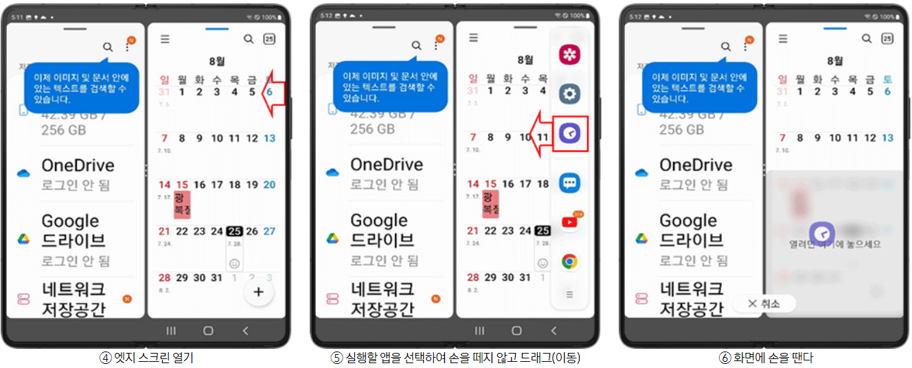 앱 실행 > 엣지 스크린 열기 > 앱을 드래그하여 이동 > 엣지 스크린 열기 > 앱을 드래그하여 이동