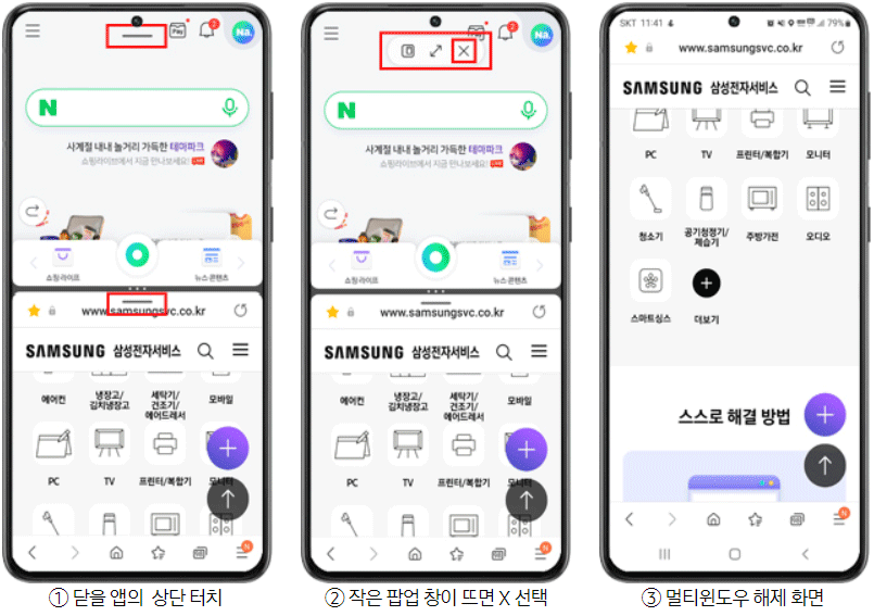 멀티윈도우 사용후 닫을 창 상단을 터치 > 팝업창이 뜨면 X 선택
