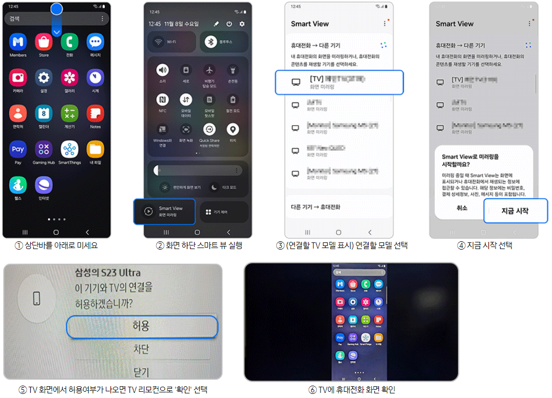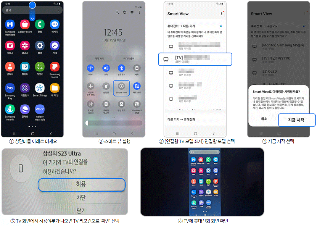 상단바를 아래로 미세요 > 스마트 뷰 실행 > (연결할 TV 모델 표시) 연결할 모델 선택 > 지금 시작 선택 > TV 화면에서 허용여부가 나오면 TV 리모컨으로 '확인' 선택 > TV에 휴대전화 화면 확인