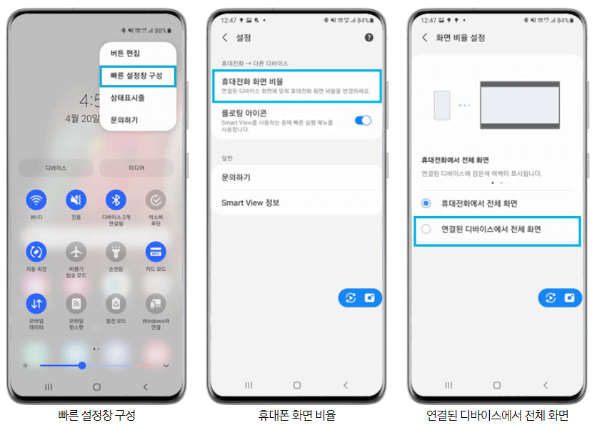 빠른 설정창 구성 > 휴대폰 화면 비율 > 연결된 디바이스에서 전체 화면