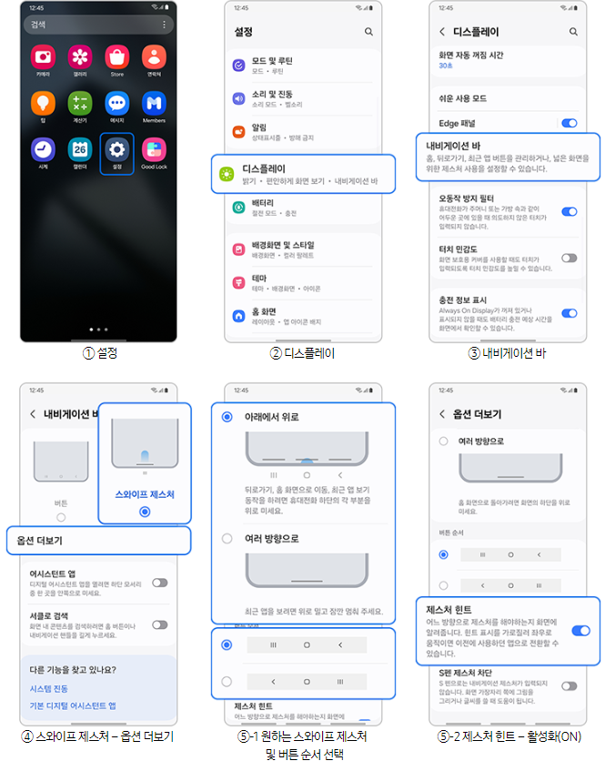 설정 > 디스플레이 > 내비게이션 바 > 스와이프 제스처 - 옵션 더 보기 > 원하는 스와이프 제스처 및 버튼 순서 선택 / 제스처 힌트 활성화(ON)