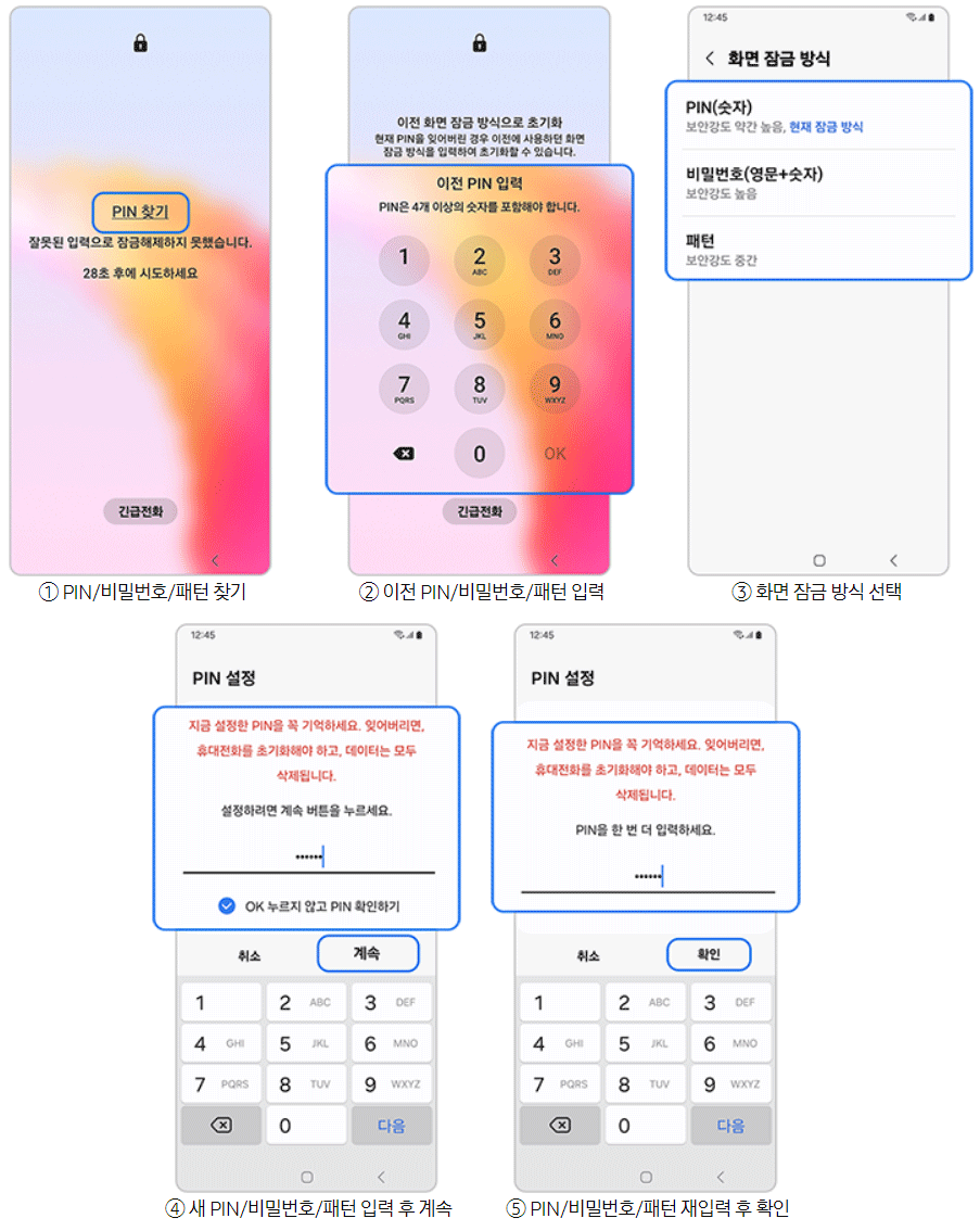 PIN/비밀번호/패턴 찾기 > 이전 PIN/비밀번호/패턴 입력 > 화면 잠금 방식 선택 > 새 PIN/비밀번호/패턴 입력 후 계속 > 새 PIN/비밀번호/패턴 재입력 후 확인
