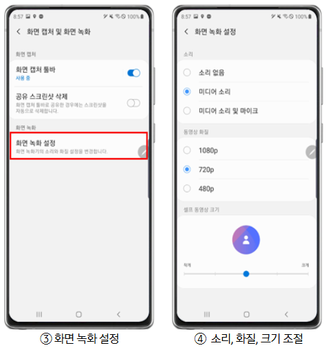사용자의 설정에 따라 화면녹화 소리를 조절하거나 동영상 화질도 선택하실 수 있습니다.