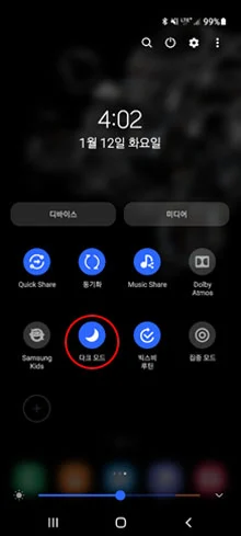 상단바를 아래로 미세요 > 다크 모드 선택> 다크 모드 해제