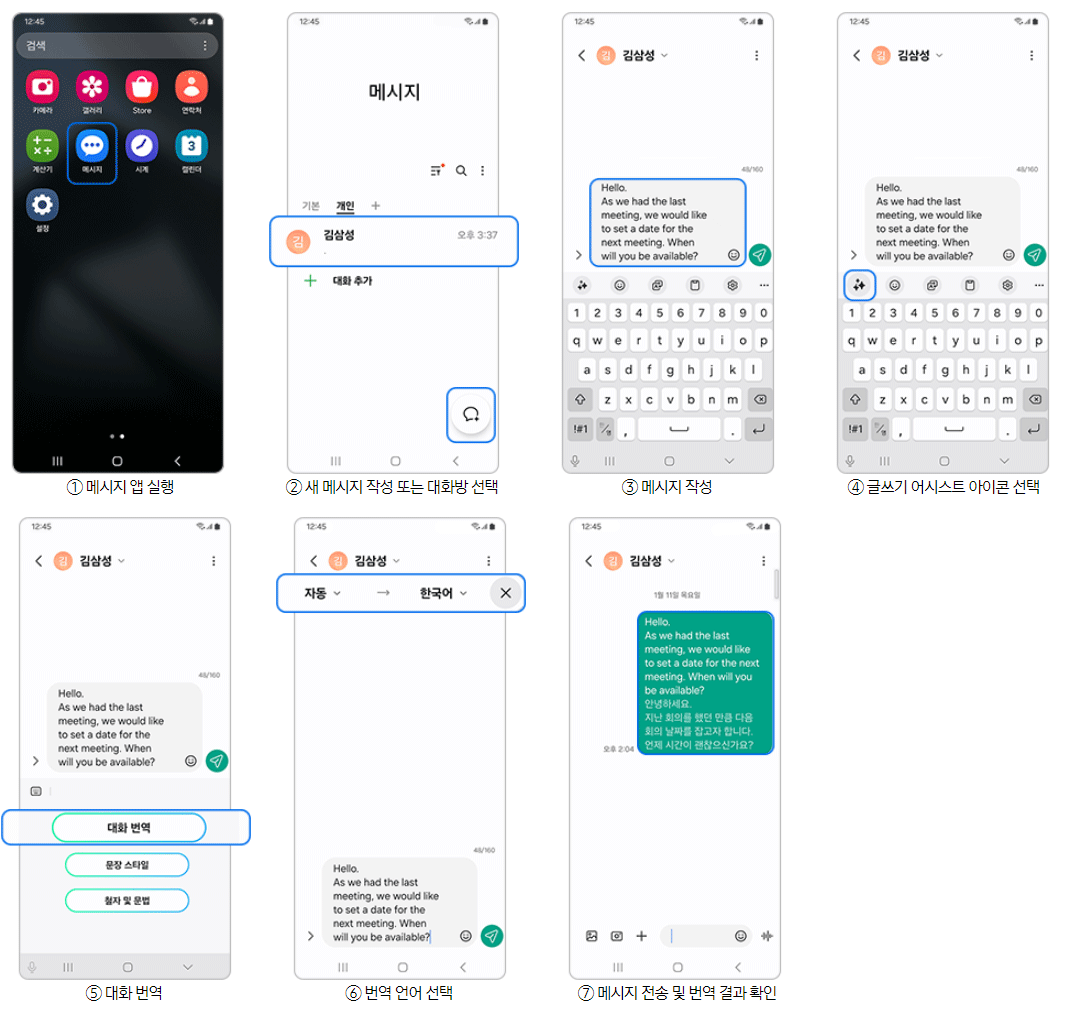메시지 앱 실행 > 새 메시지 작성 또는 대화방 선택 > 메시지 작성 > 글쓰기 어시스트 아이콘 선택 > 대화 번역 > 번역 언어 선택 > 메시지 전송 및 번역 결과 확인