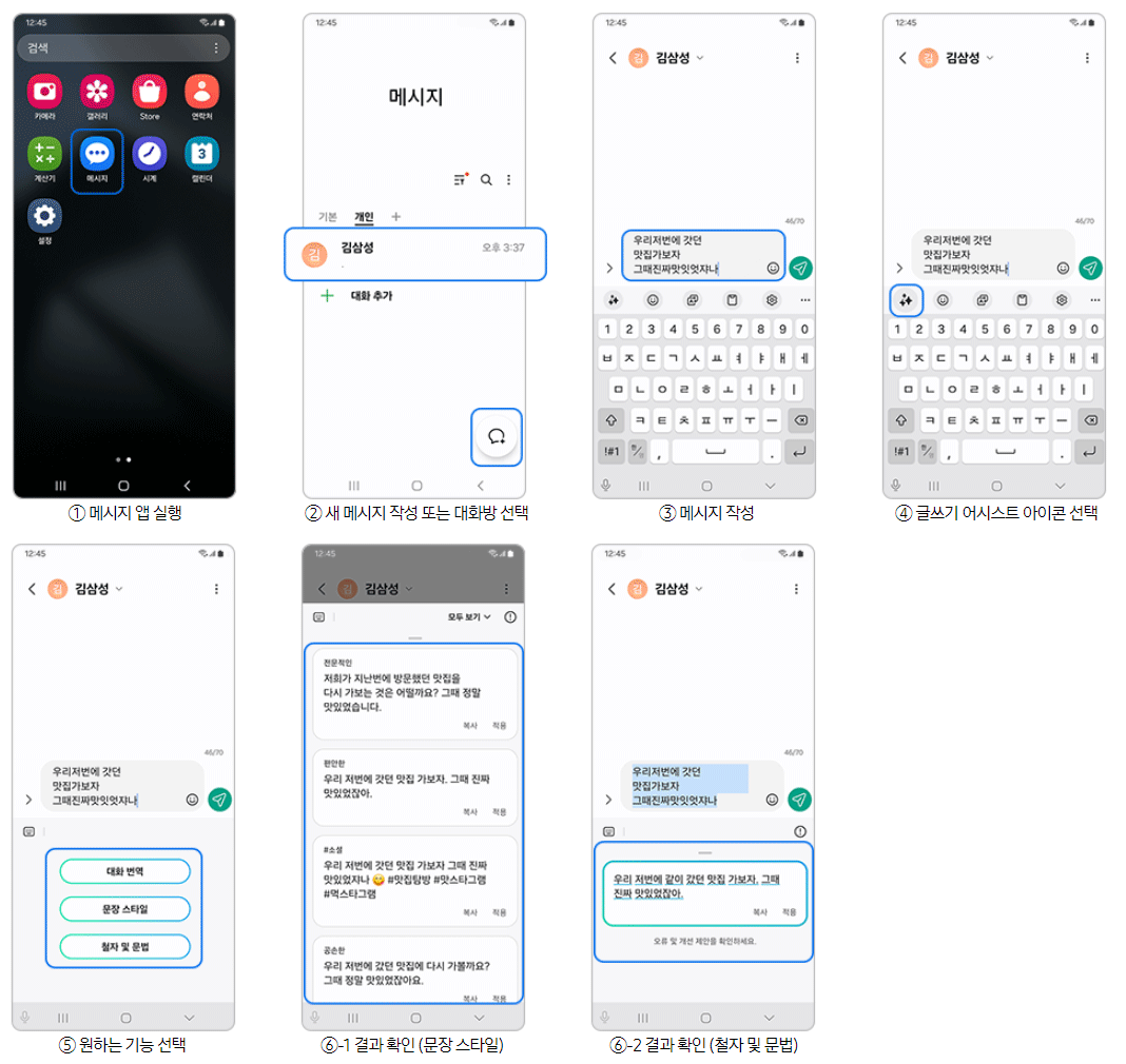 메시지 앱 실행 > 새 메시지 작성 또는 대화방 선택 > 메시지 작성 > 글쓰기 어시스트 아이콘 선택 > 원하는 기능 선택 > 결과 확인