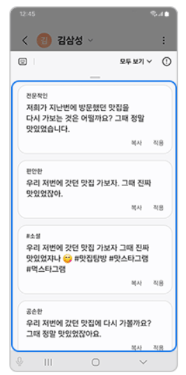 갤럭시 S24 AI가 교정해 준 문장 스타일 중 원하는 것으로 선택해 메시지를 보내면 됩니다.