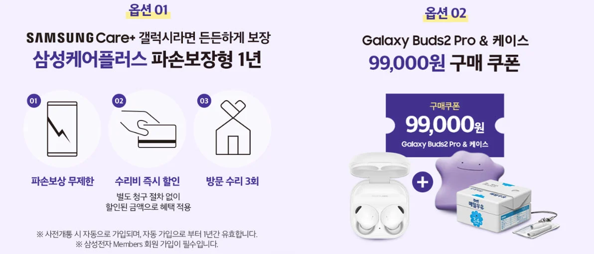 첫번째는 1년 동안 파손보상이 되는 삼성케어 플러스 파손보장으로 1년 동안 무료입니다. 이걸 선택하면 사전개통할 때 자동으로 가입되고, 1년간 유효해요.