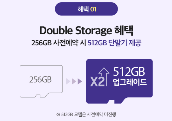 사전예약 기간동안 갤럭시 S24, S24+, S24울트라 256GB를 구매하면 512GB로 더블 업그레이드를 해줘요. 핸드폰 바꿀 때마다 용량과 가격사이에서 고민이 많잖아요.