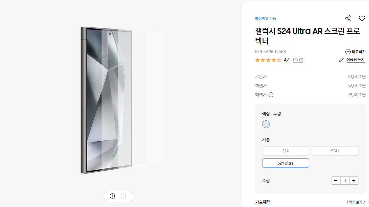 정식 명칭은 '갤럭시 S24 Ultra AR 스크린 프로텍터'로 기종 관계없이 28,800원입니다. (정가 33,000원)