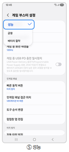 사용자의 게임 경험을 향상시켜줄 수 있는 기능으로 게임 성능 수준을 설정하고, 게임별 맞춤 설정을 적용할 수 있는 등 갤럭시 S25 시리즈부터 One UI 7 적용과 함께 게임 부스터 설정 및 기능이 개선되었습니다.