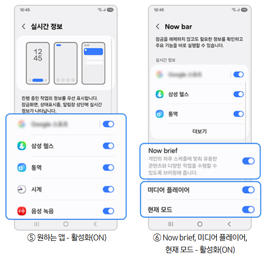 3. 나우 브리프(Now brief), 미디어 플레이어, 현재 모드등 원하는 옵션을 활성화(ON)하여 사용해 보세요.