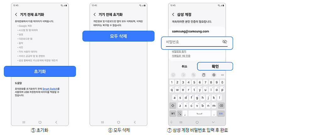 갤럭시 폰에 삼성 계정으로 로그인된 경우에는 삼성 계정 비밀번호를 입력해야 초기화가 진행됩니다. 계정이 없는 휴대폰은 바로 초기화가 진행됩니다.