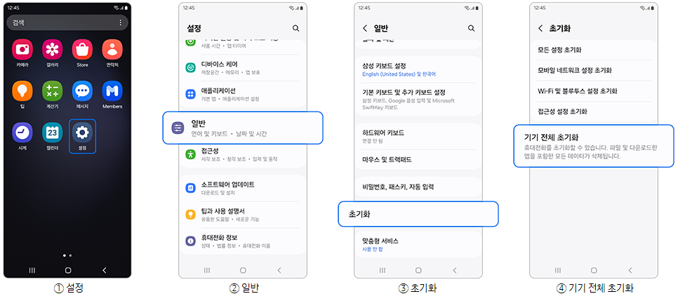 삼성의 모든 휴대폰은 전체 초기화를 진행할 경우 공장 출시 상태로 돌아가며, 그동안 저장된 모든 데이터(사진, 동영상, 파일, 문서 등)가 삭제됩니다.