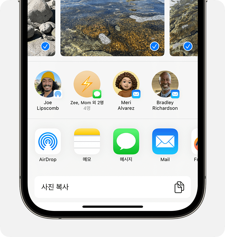 'AirDrop' 버튼을 탭한 후 공유하려는 사용자를 탭합니다. AirDrop 사용자 또는 본인의 다른 기기가 표시되지 않는 경우 수행할 작업을 알아봅니다.