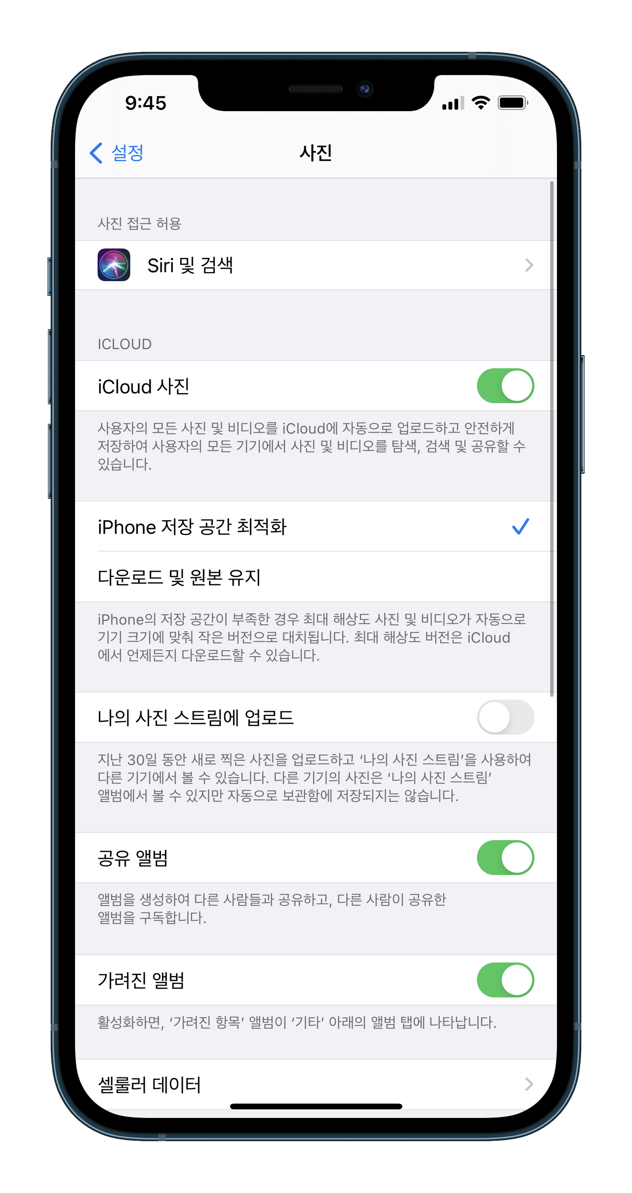 저장공간이 부족한 경우 최대 해상도 사진 및 비디오가 자동으로 기기크기에 맞춰 작은 버전으로 대치됩니다. 따라서 원본 파일을 그대로 가지고 있어야 하는 분은 설정하시면 안되니 참고해주세요.