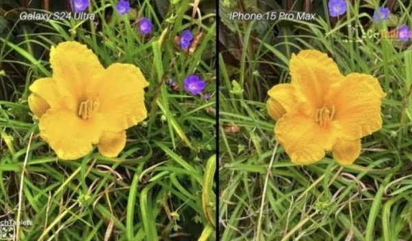 두 카메라가 노란색 꽃의 디테일을 전혀 다르게 표현하고 있습니다.