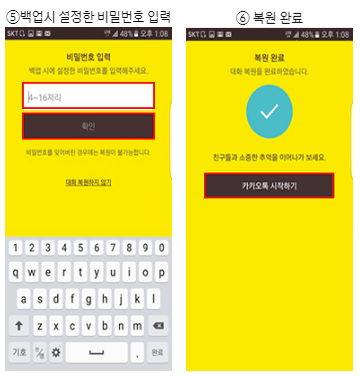 * 카카오톡에서 데이터 백업 시 입력한 비밀번호는 찾기 기능을 지원하지 않습니다. 사전에 잊지 않도록 적어두시거나 꼭 기억해 주세요.