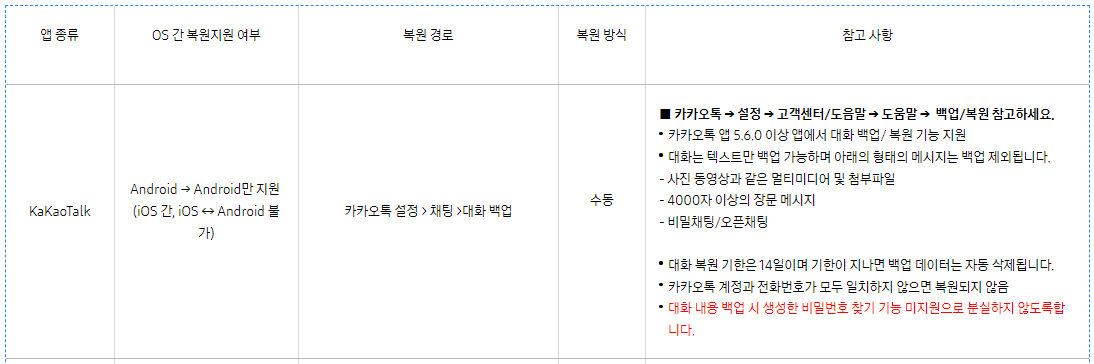 더 자세한 PC카카오톡 백업 복원과 라인 앱(Line App) 대화 백업 복원에 대해서 삼성 센터에서 정리한 내용을 참고하시면 쉽게 따라 하실 수 있습니다.