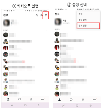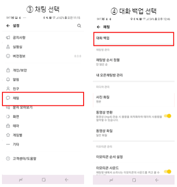 카카오톡 실행 후 '설정 → 전체설정 → 채팅 선택 → 대화 백업 선택 → 대화 백업하기'를 이용해 대화 내용을 백업합니다.