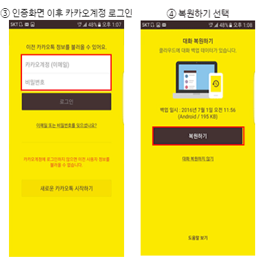 카카오계정에 로그인하지 않을 경우 신규가입으로 처리되어 기존 정보가 모두 초기화됩니다. 따라서 복원이 불가능하므로 꼭 주의해 주세요.