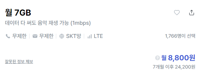 위 요금제는 7개월 동안은 8,800원이고 이후 24,200원으로 요금이 오른다는 뜻이에요. 그러니 7개월 이후는 다른 요금제로 이동하는 것이 훨씬 이익이겠죠.