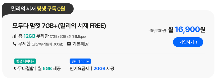 16,900원 요금제 알아보기 + 밀리의서재 0원