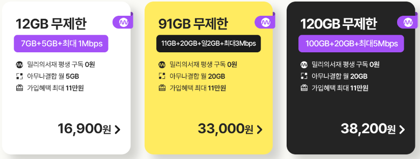 밀리의 서재 무료 서비스가 포함된 요금제는 대표적으로 12GB 무제한 요금제, 91GB 무제한 요금제, 120GB 무제한 요금제 3종류가 있습니다.